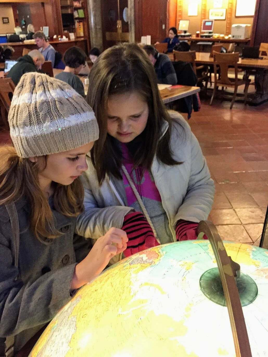 We also love the map room which is filled with, you guessed it!, maps. Our favorite maps are the globes. We also love the reading room because of the high ceilings and detailed architecture.